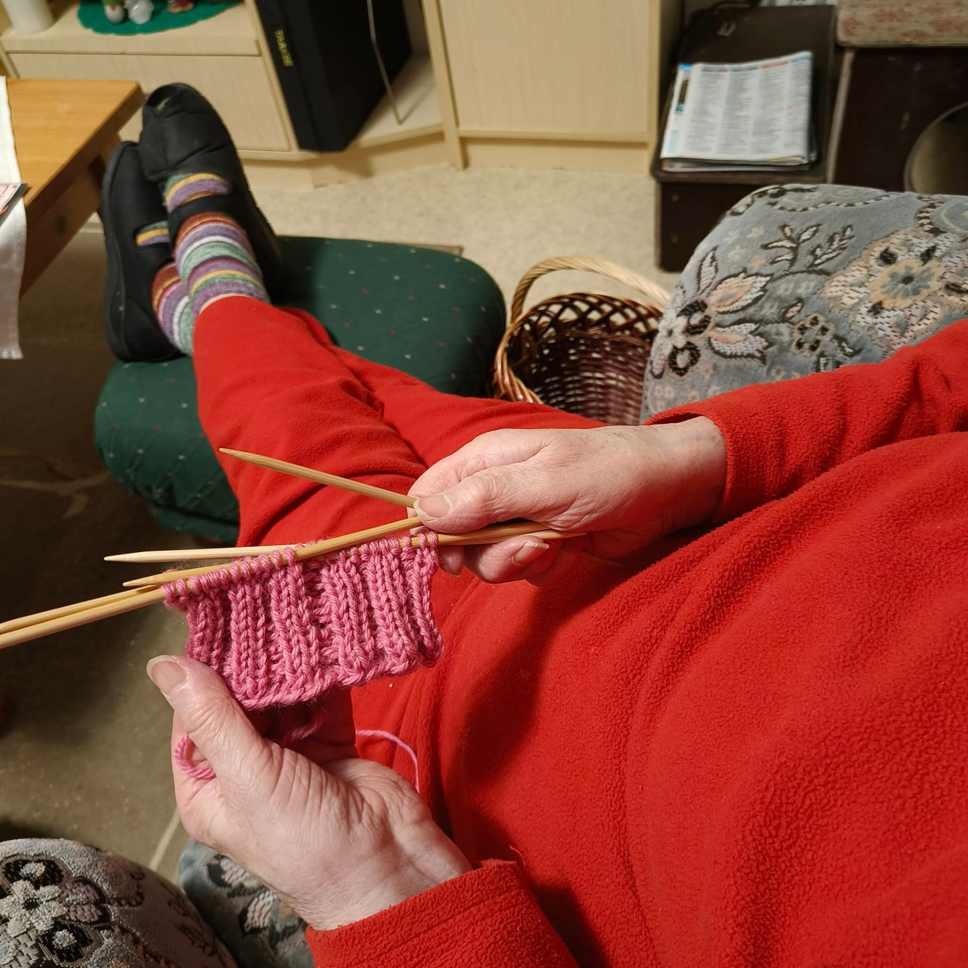 Autoin häntä silmukoiden luomisessa, ja siinä miten työ etenee kerros kerrokselta. Vaikka neulominen ei enää sujunut aivan entiseen tapaan, hetki oli lämmin ja merkityksellinen. Valmiit säärystimet kertovat nyt sekä äidin sitkeydestä että meidän yhteisestä tekemisestämme – pienestä, mutta tärkeästä muistosta, joka lämmittää sekä jalkoja että mieltä.